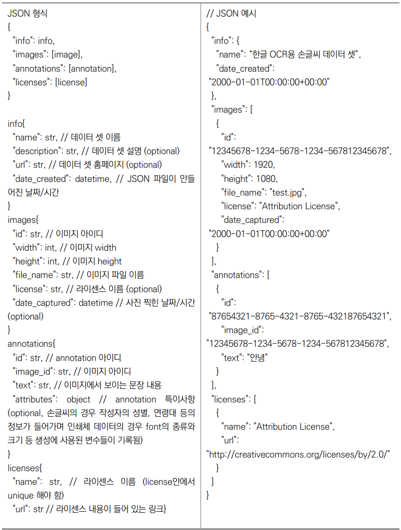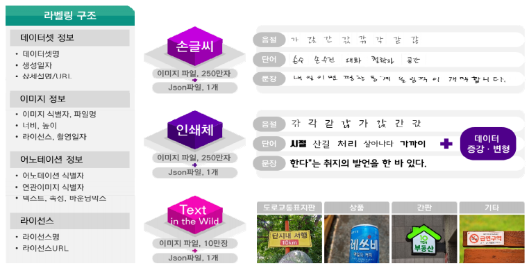 전체 데이터는 다음과 같이 크게 손글씨, 인쇄체, 실사 데이터셋으로 구분돼있다. 각각의 데이터셋은 데이터셋 정보가 담긴 Json파일이 한 개씩 있어 그 파일을 참고하여 데이터를 선별할 수 있다.